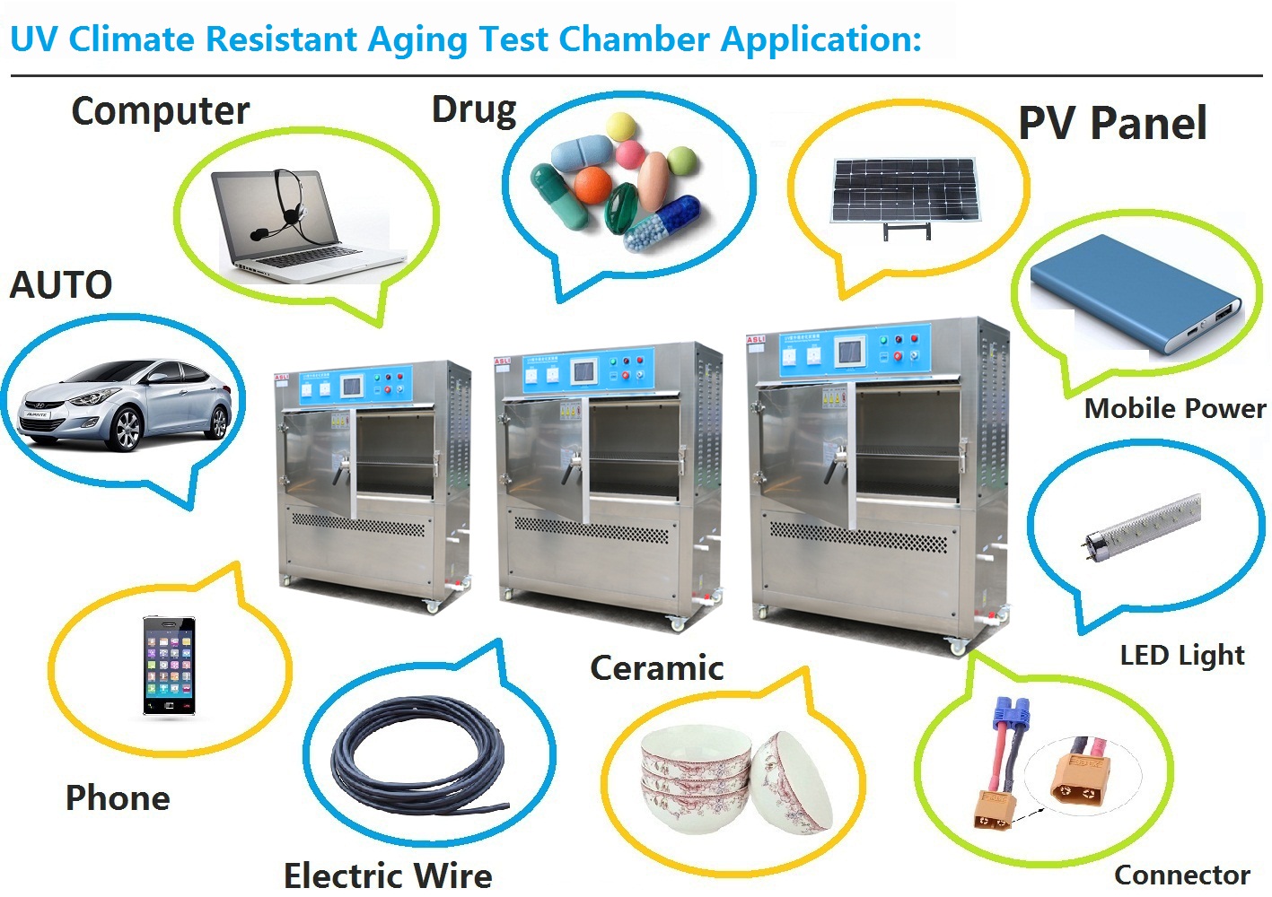 UV chamber is equipped with fluorescent UV lamp which can completely simulate the UV spectra of sunlight, exposes materials to alternating cycles of UV light and moisture at controlled, elevated temperatures. It simulates dew and rain with condensing humidity and/or water spray.